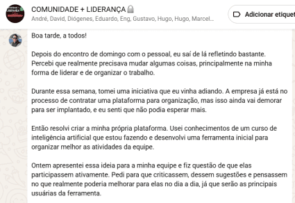 “Depois do encontro de domingo, percebi que precisava mudar a forma como estava organizando o trabalho da minha equipe. Então tomei uma iniciativa que vinha adiando: criei uma ferramenta inicial para organizar melhor as atividades do time e apresentei a ideia para eles. Pedi críticas, sugestões e melhorias, porque serão eles que usarão isso todos os dias.”