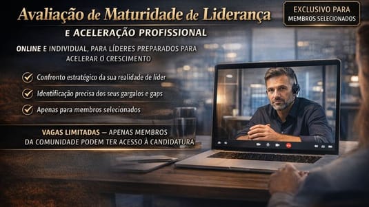 Na Comunidade + Liderança, você poderá se candidatar à Avaliação de Maturidade de Liderança e Aceleração Profissional individual comigo. Não é motivação nem mentoria gratuita — é uma análise objetiva da sua realidade profissional, maturidade como líder e dos gargalos que limitam seu crescimento.